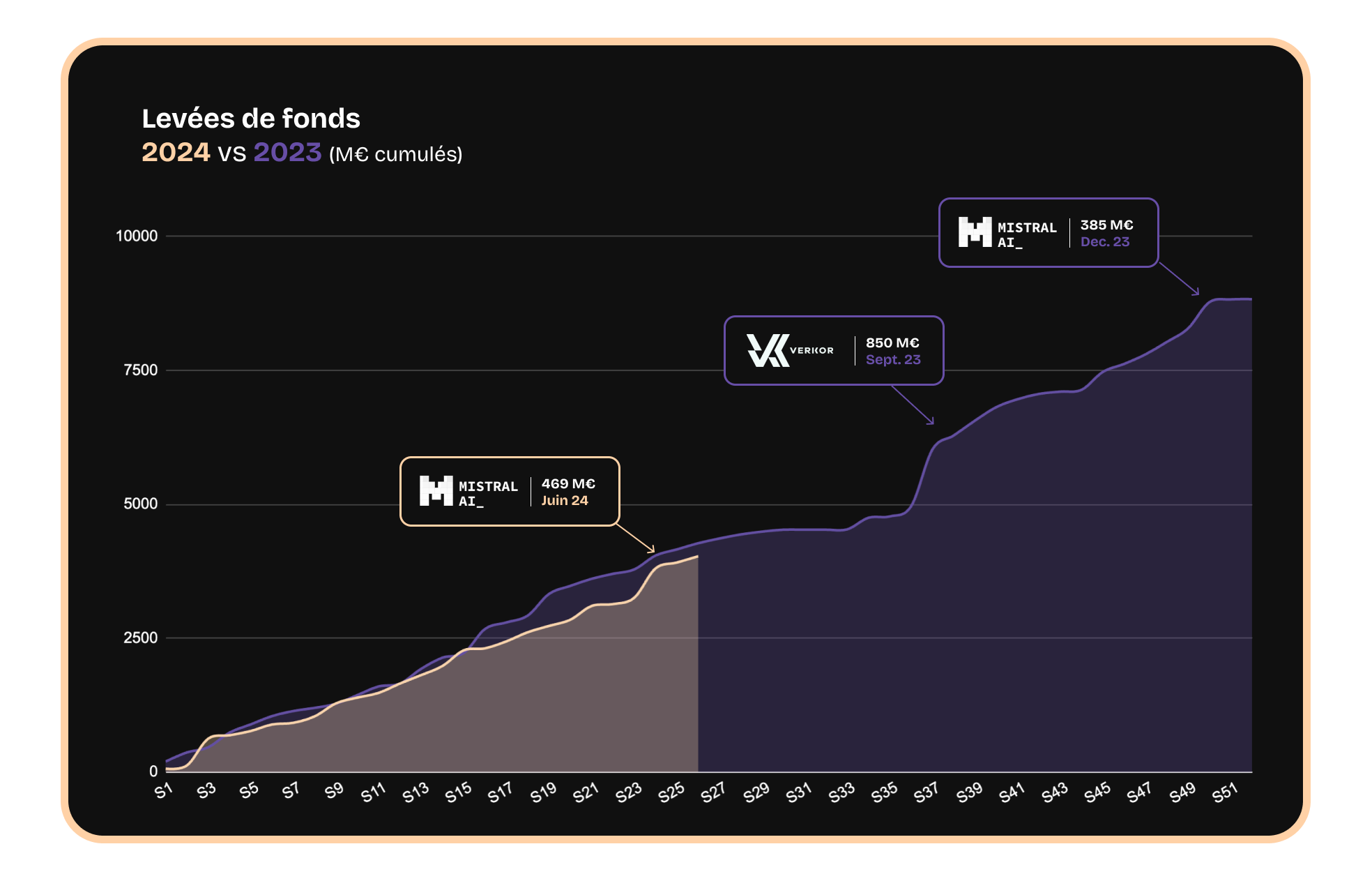À noter : on dépasse cette semaine les 4 Md€ levés à date en 2024. Pour l’instant, les projections envisagent un montant annuel levé compris entre 7 Md€ et 8 Md€ (légèrement inférieur à 2023). Le mix évoluerait fortement en revanche, au bénéfice de deux secteurs : l’énergie et l’IA.
