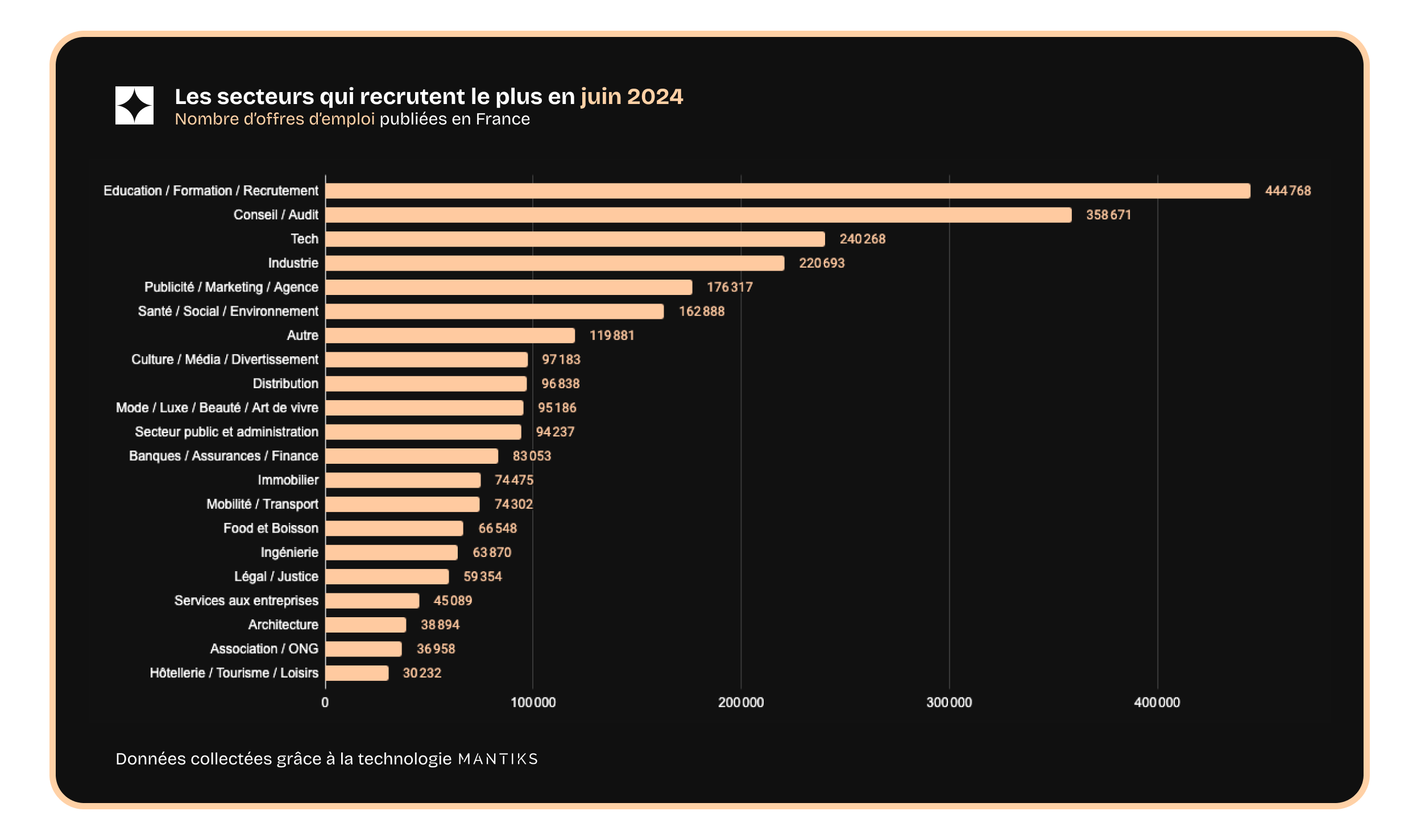 Le secteur de l’Education / Formation / Recrutement arrive en premier, mais à nuancer, car la plupart des annonces viennent des entreprises d’interim qui recrutent pour les autres secteurs.
