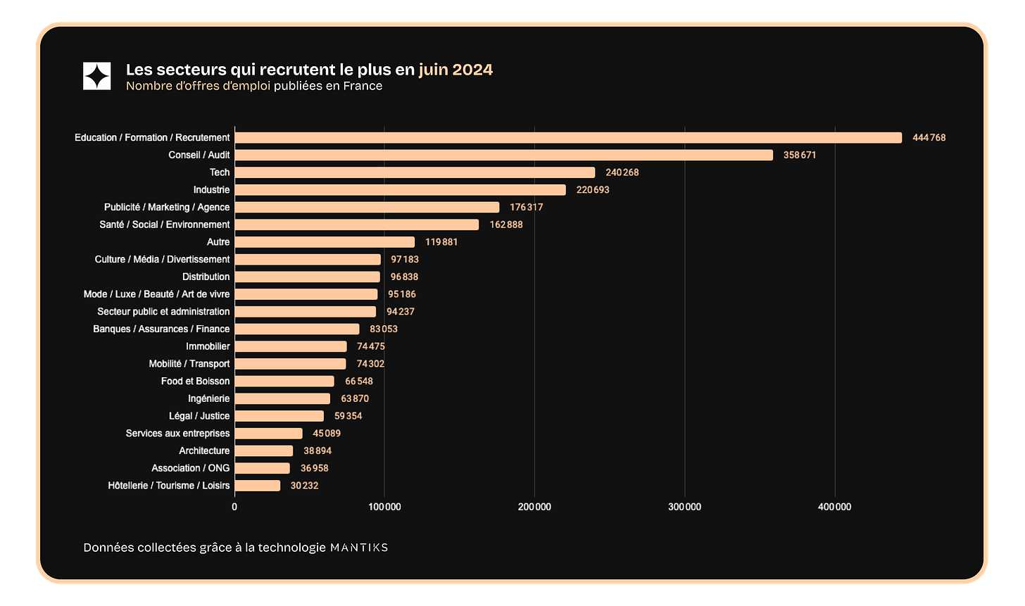 Cette semaine, on s’intéresse aux secteurs qui recrutent le plus en France. Sans surprise, on retrouve des secteurs qui sont très porteurs et qui recrutent souvent sur des fonctions en tension : tech, industrie, conseil…